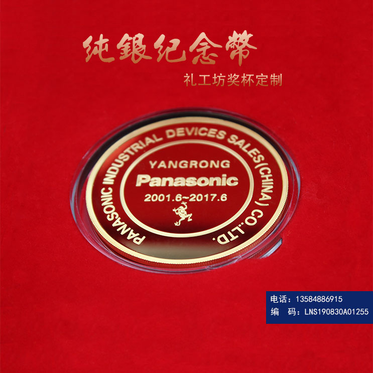 松下純銀紀念幣 直 徑:80MM 重 量:60克 材 質:純銀鍍金 包 裝:禮盒 編 碼:LNS190830A01255