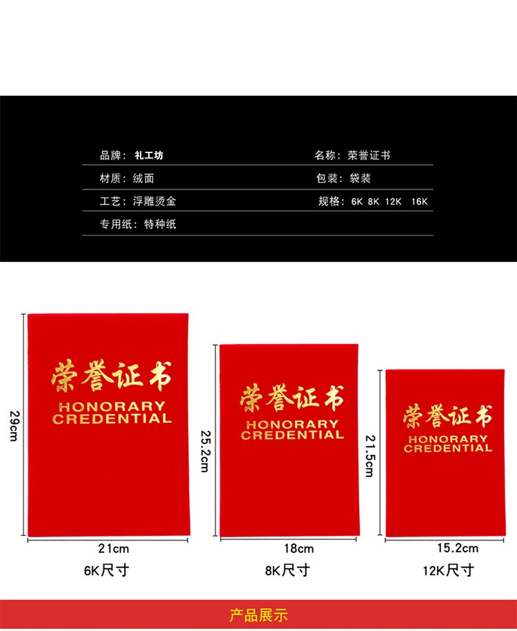 紅色榮譽證書、12K、8K、6K植絨布材質 內芯現場打印
