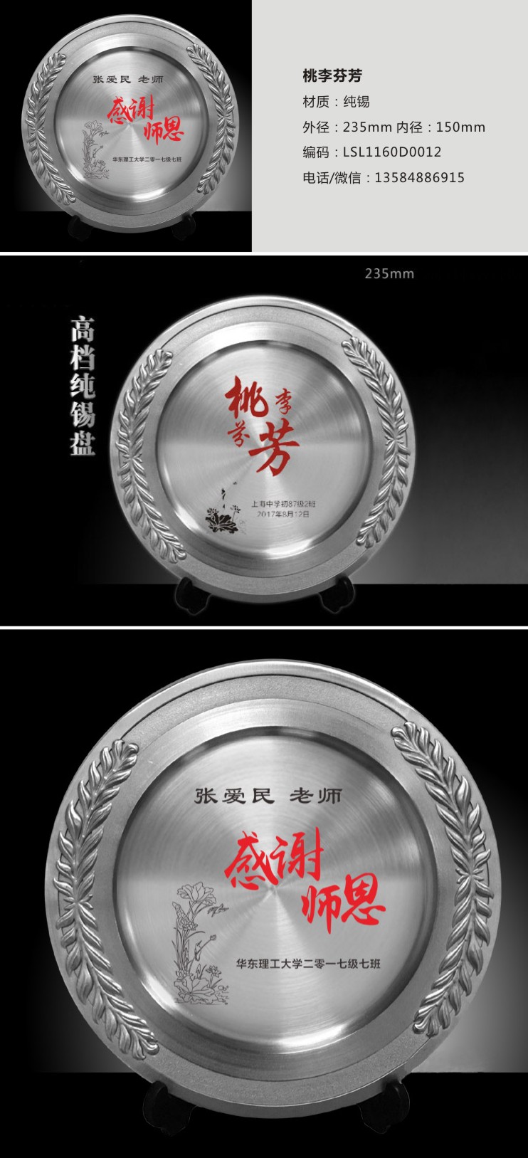 桃李芬芳錫盤、訂購電話/微信同號(hào):13584886915 。浮雕花紋1塊起訂,免費(fèi)腐蝕刻字,配禮盒、純錫色款工期通常:7天發(fā) ,適用:?jiǎn)T工
