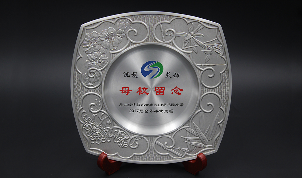 蘇州純錫感謝牌、錫盤采用97%以上純錫制造,錫盤周圍均由栩栩如生浮雕花紋或風景 或人物或建筑圖。產品中間部分可根據客戶要求定制個性化文字或圖案,內涵豐富、寓 意深遠,深