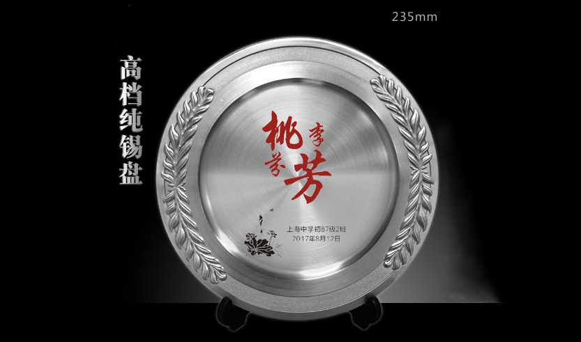 桃李芬芳錫盤、訂購電話/微信同號:13584886915 。浮雕花紋1塊起訂,免費腐蝕刻字,配禮盒、純錫色款工期通常:7天發 ,適用:員工 (部門)進步獎、開拓獎、成長獎,是對獲獎者取得